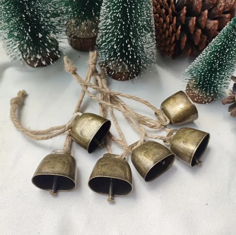Set de 6 campanas de metal acabado en color dorado/negro, cordón de yute. Boquilla de 3.8cm de ancho x 3.8cm de alto