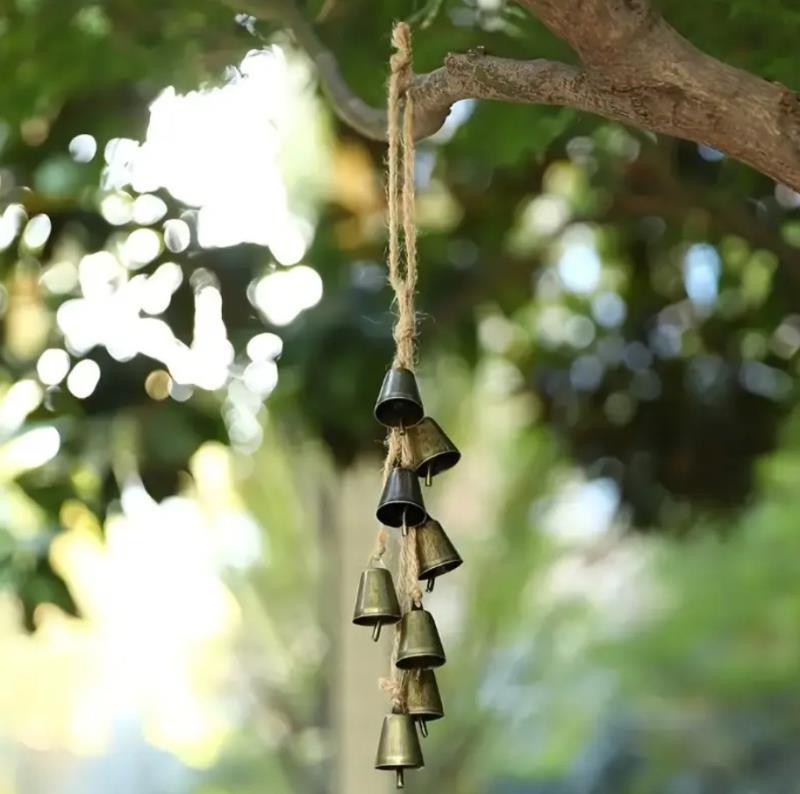 Set de 6 campanas de metal acabado en color dorado, cordón de yute. Campana: 2.6cm x 3.6cm