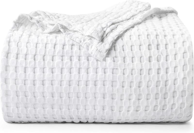 Manta de algodón gofre de 300 g/m², color blanco. Disponibilidad de colores: Amarillo, verde, morado, gris, negro, rojo, rosa. Tamaños: Individual, matrimonial, king, queen. Dimensiones: 2.30 x 2.30m